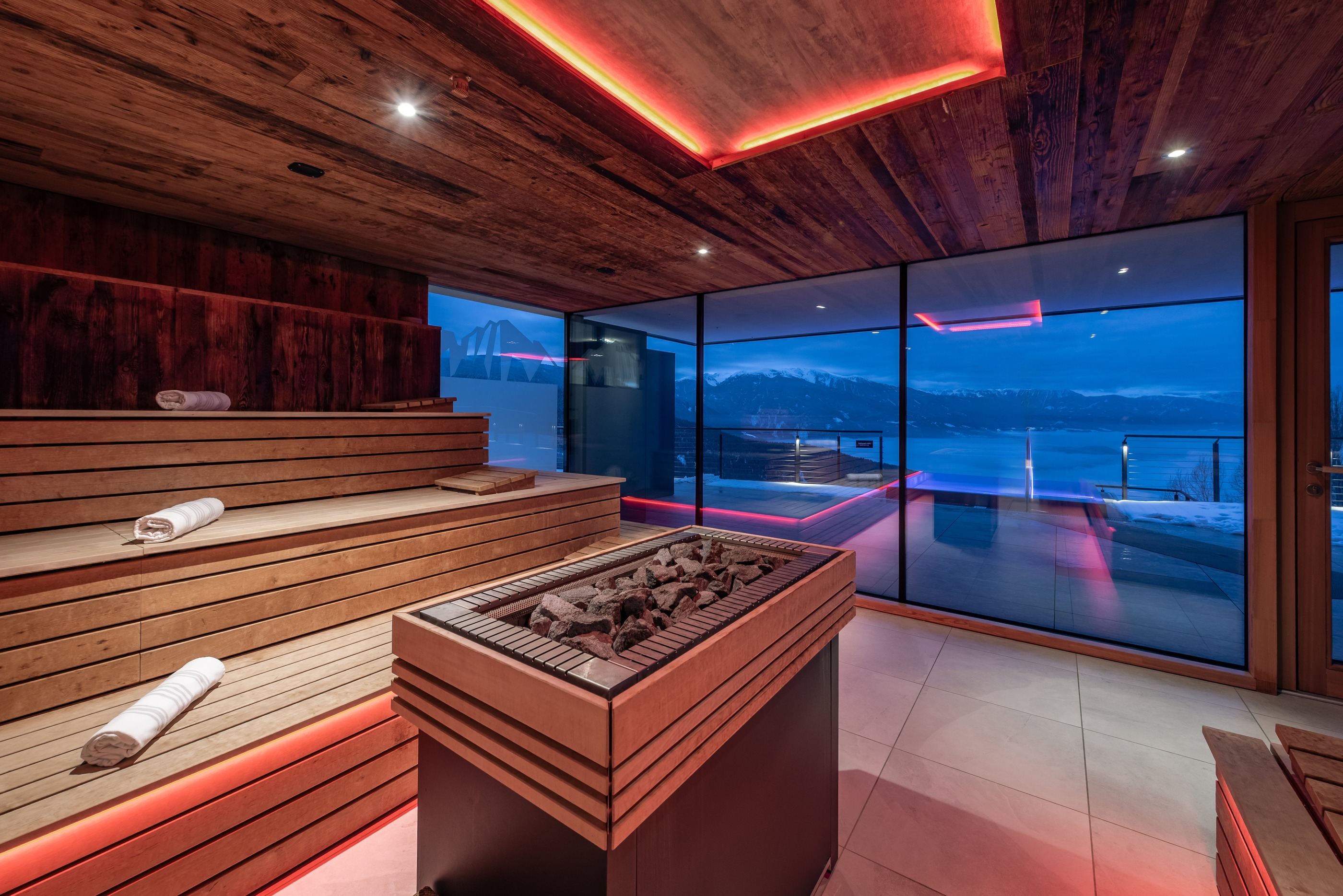 In der 90°C Eventsauna mit Panoramablick erleben Sie täglich aromatische Aufgüsse unserer Saunameister, ergänzt durch Alpenkräuter-Sauna, Bio-Vitalsauna, Dampfbad und Infrarotkabine.